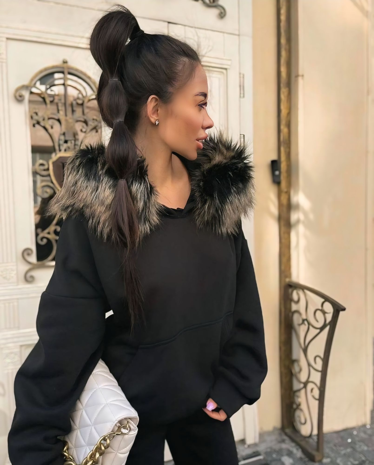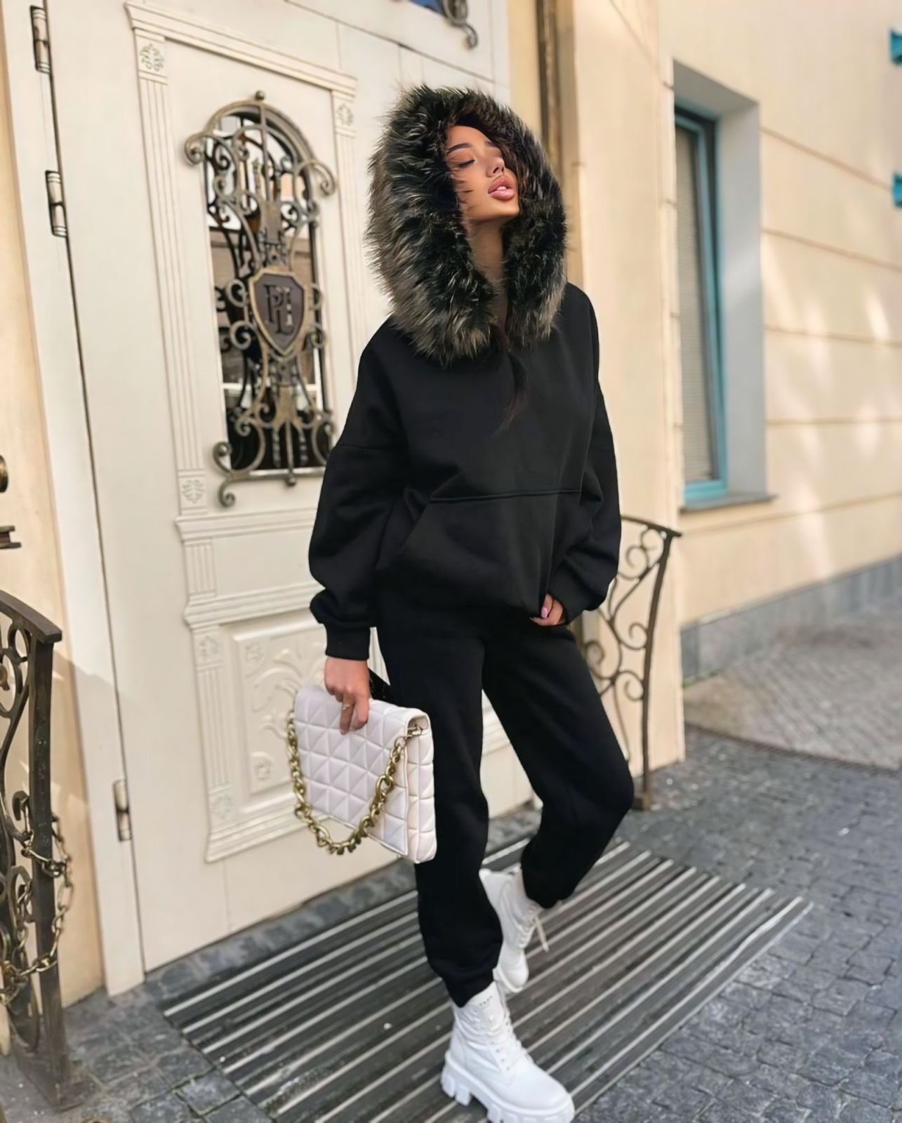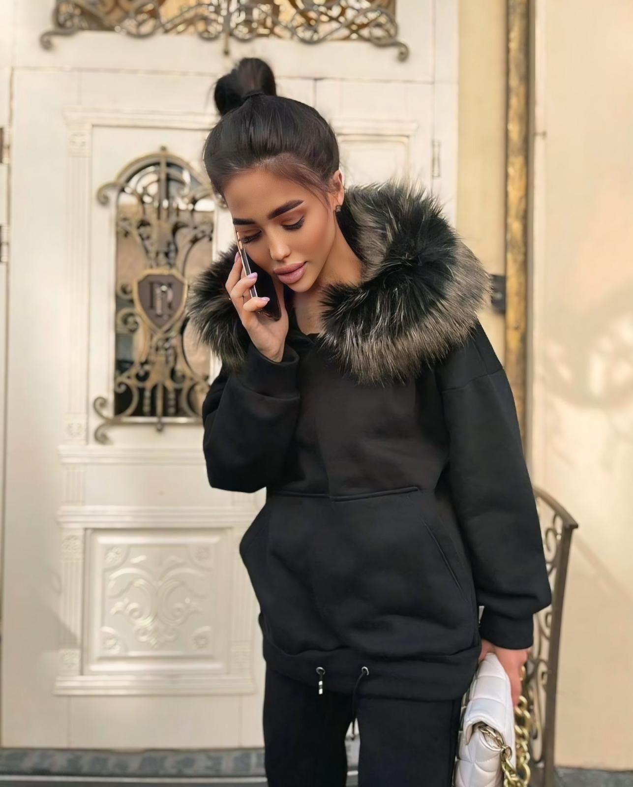 Compleu statement, din bumbac gros și moale la interior, compus din hanorac oversized cu glugă decorată cu blană eco luxuriantă și pantaloni tip jogger cu croi relaxat. Designul îmbină confortul urban cu estetica glam, creând un look spectaculos și effortless. Perfect pentru zilele reci, ieșiri casual sau ținute de travel în care vrei să arăți impecabil fără efort.