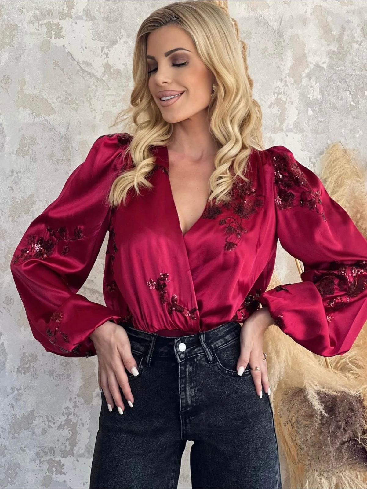 Decolteul în V evidențiază linia bustului, în timp ce mânecile bufante creează volum și un look statement 👗 Croiala tip body se mulează perfect pe corp, fiind ideală atât pentru ținute de seară, cât și pentru combinații chic cu pantaloni sau fuste 👠