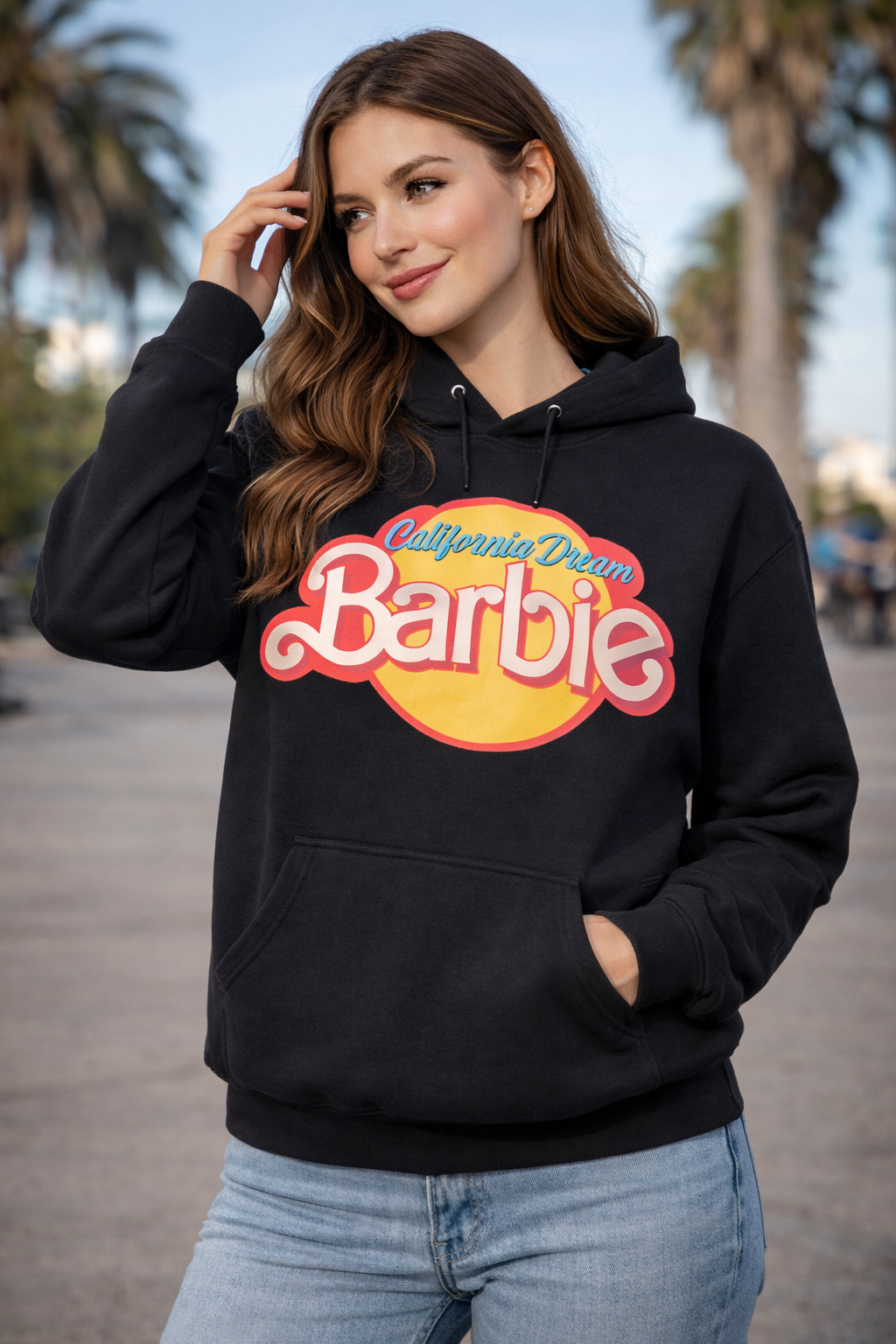 n statement piece clar, fără compromisuri. Hanoracul „California Dream Barbie” livrează exact ce promite: vibe urban, energie pop-culture și confort real. Croială lejeră, modernă, gândită pentru purtare zilnică, indiferent de sezon. Material premium, moale la atingere, cu structură care își păstrează forma în timp. Print frontal iconic, culori vibrante, impact vizual imediat – se vede de la distanță și se reține instant.